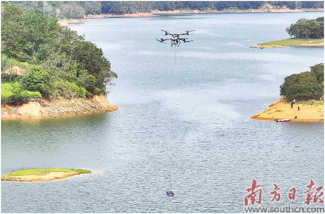 4日,无人机将荔枝从茂名高州水库中的湾边岛上运输到岸上的仓储物流中心。南方日报记者 钟志辉 张令 摄