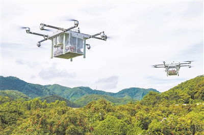 在现代物流和冷链技术加持下,依托航空运输优势,荔枝从广州直送西安,只需两个小时。目前,这条“飞机+冷链”的“荔枝飞路”已经覆盖全国约2800个县域,刚下枝头的荔枝次晨或者隔日便可送到消费者手中,身在各地都能享受几乎与岭南无异的鲜美荔枝。图为6月28日,在广州市从化区天人山水荔枝园,物流无人机运输刚刚采摘的荔枝。