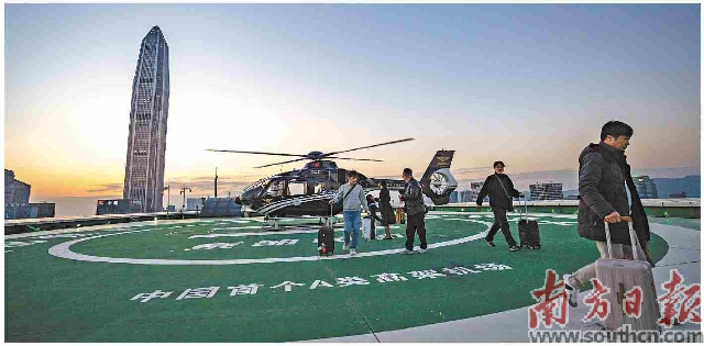 广东加快抢占新风口,推动低空经济基础设施密集落地,加速释放应用场景,以空域资源重塑产业格局。图为深圳大中华交易广场顶楼停机坪上,“打飞的”到站的乘客正走下直升机。南方日报记者 张令 摄