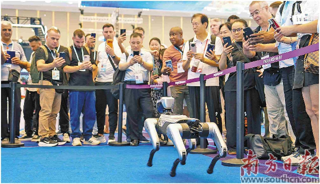 10月19日,广交会展馆内,机器狗的表演吸引众多采购商围观。南方日报记者 张令 钟志辉 摄