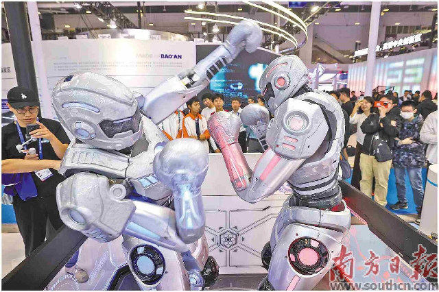第27届高交会现场,观众通过操控类人形机器人进行“对战”,互动感拉满。南方日报记者 朱洪波 摄
