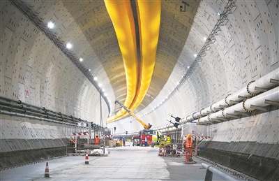 科技日报讯 (记者王延斌)6月22日,随着直径达17.5米的“山河号”盾构机平稳穿越黄河南岸大堤,标志着世界最大直径水下盾构隧道工程建设完成黄河段掘进。图为中铁十四局建设者在济南市黄岗路穿黄隧道内作业。