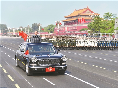 雄壮的军乐声中,习近平乘车沿着宽阔的长安街,依次检阅13个徒步方队、1个战旗方队、22个装备方队。受阅部队军容严整、意气风发,铁甲战车整齐列阵、威风凛凛。这是人民军队奋进建军百年的崭新亮相,这是中华民族捍卫世界和平的坚定宣示。