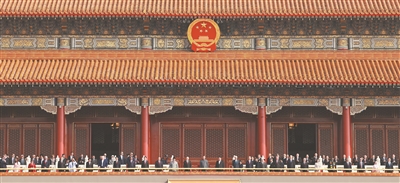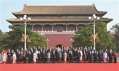 大会开始前,习近平和夫人彭丽媛在端门外广场迎接出席大会的外方代表团团长及其配偶,并同他们合影留念。