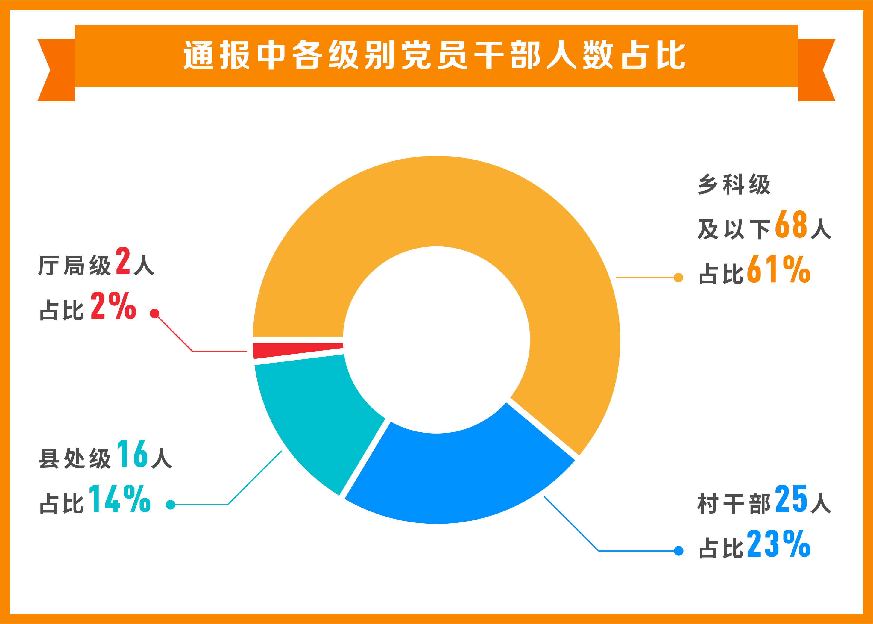 从处理各级别党员干部人数看,通报查处的111位党员干部中,村干部25人,占全部人数23%;乡科级及以下68人,占全部人数61%;县处级16人,占全部人数14%;厅局级2人,占全部人数2%。数据显示,公开曝光的形式主义、官僚主义问题主要是发生在县以下基层单位,地市级、省级和中央单位查处的问题少。但基层反映,形式主义、官僚主义发生在地市级、省级和中央单位的问题也不容忽视,有的单位问题还比较突出,甚至是基层问题根源所在。