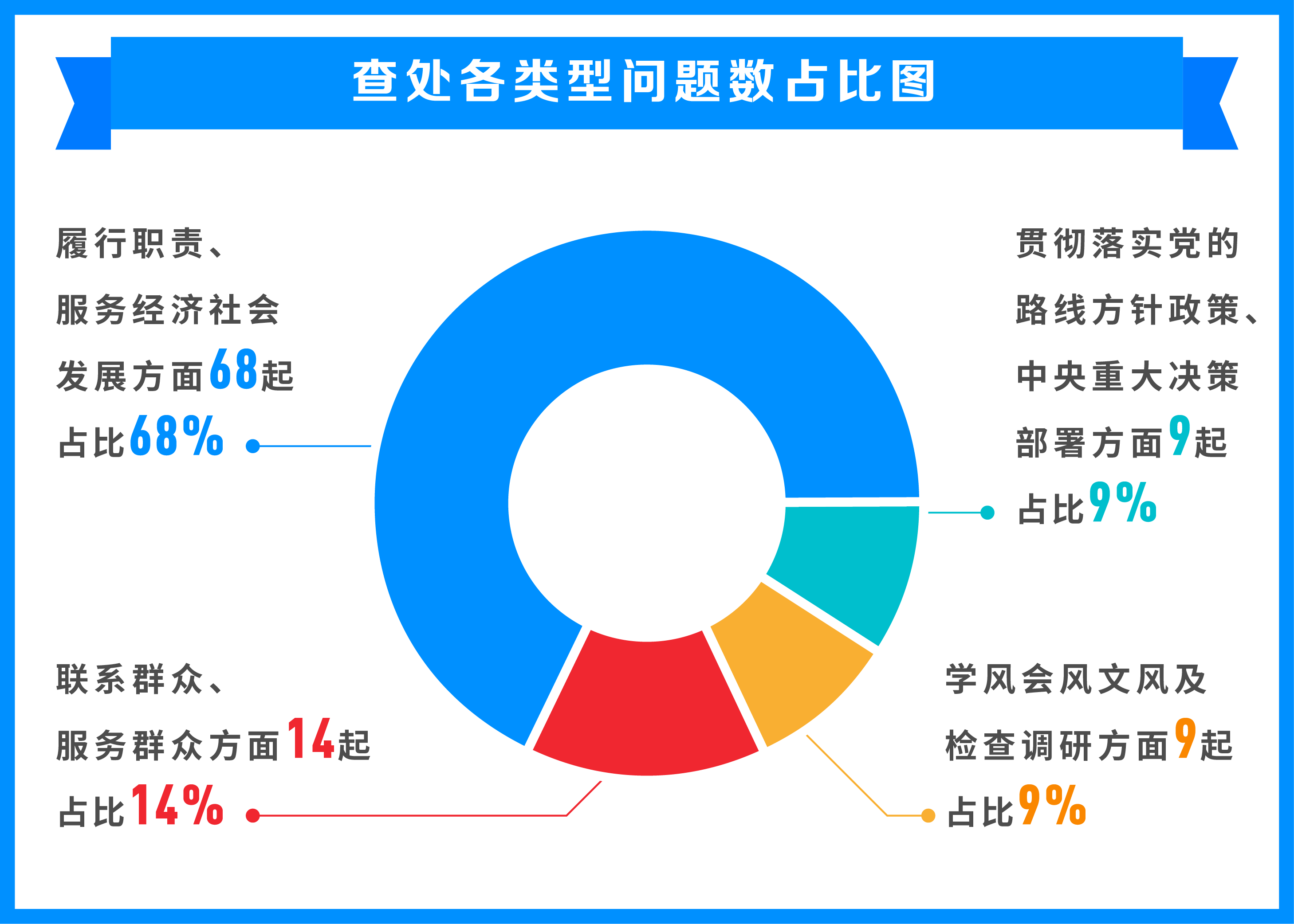 从具体问题类型看,贯彻落实党的路线方针政策、中央重大决策部署方面问题9起,占问题总数9%;联系群众、服务群众方面问题14起,占问题总数14%,其中漠视群众利益和疾苦问题7起、服务态度差办事效率低问题7起;履行职责、服务经济社会发展方面问题68起,占问题总数68%,其中乱决策乱拍板乱作为问题13起、不担当不作为不负责问题46起、弄虚作假问题9起;学风会风文风及检查调研方面问题9起,占问题总数9%。这些问题贻误工作,劳民伤财。各级纪检监察机关要紧扣落实中央八项规定精神主题,把破除形式主义、官僚主义作为巩固拓展落实中央八项规定精神成果的深化,一体推进纠“四风”工作。